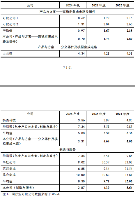 界面新闻记者查阅获知,燕东微此前曾披露过各业务板块的应收账款周转率。即使不考虑特种行业客户的拖累,公司其他业务板块应收账款周转率也令人堪忧。2022年、2023年和2024年,高稳定集成电路及器件业务应收账款周转率分别为2.89次、1.75次和0.7次,2024年低于可比公司平均值;分立器件及模拟集成电路业务应收账款周转率分别为5.06次、4.64次和3.31次,均低于行业可比公司均值;制造与服务应收账款周转率分别为8.64次、4.1次和2.87次,远低于行业可比公司均值。
