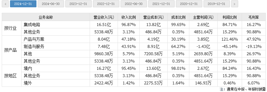 燕东微业务分为 “产品与方案” 和 “制造与服务” 两大业务板块,2024 年二者营收占比分别为 47.18% 和 43.91%,规模接近,但盈利贡献却 “冰火两重天”—— 制造与服务业务自 2023 年起长期负毛利,产品与方案业务独自贡献全部毛利,而晶圆制造(占制造与服务收入超 97%)正是亏损核心。
